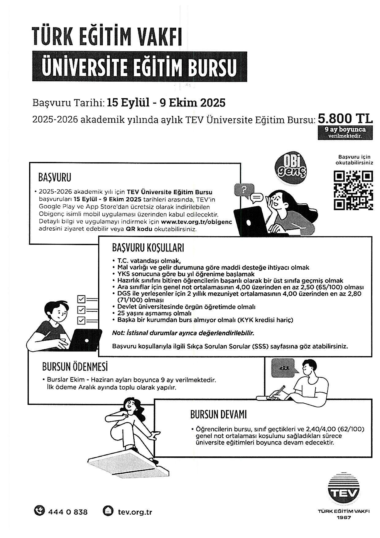 Türk Eğitim Vakfı ( TEV ) tarafından Üniversitemiz öğrencilerine burs verilecektir. TEV burs başvuruları 15 Eylül - 09 Ekim 2025 tarihleri arasında TEV'in Obigenç isimli mobil uygulaması üzerinden alınacaktır. Başvuru süreçleri hakkında detaylı bilgi için tıklayınız.