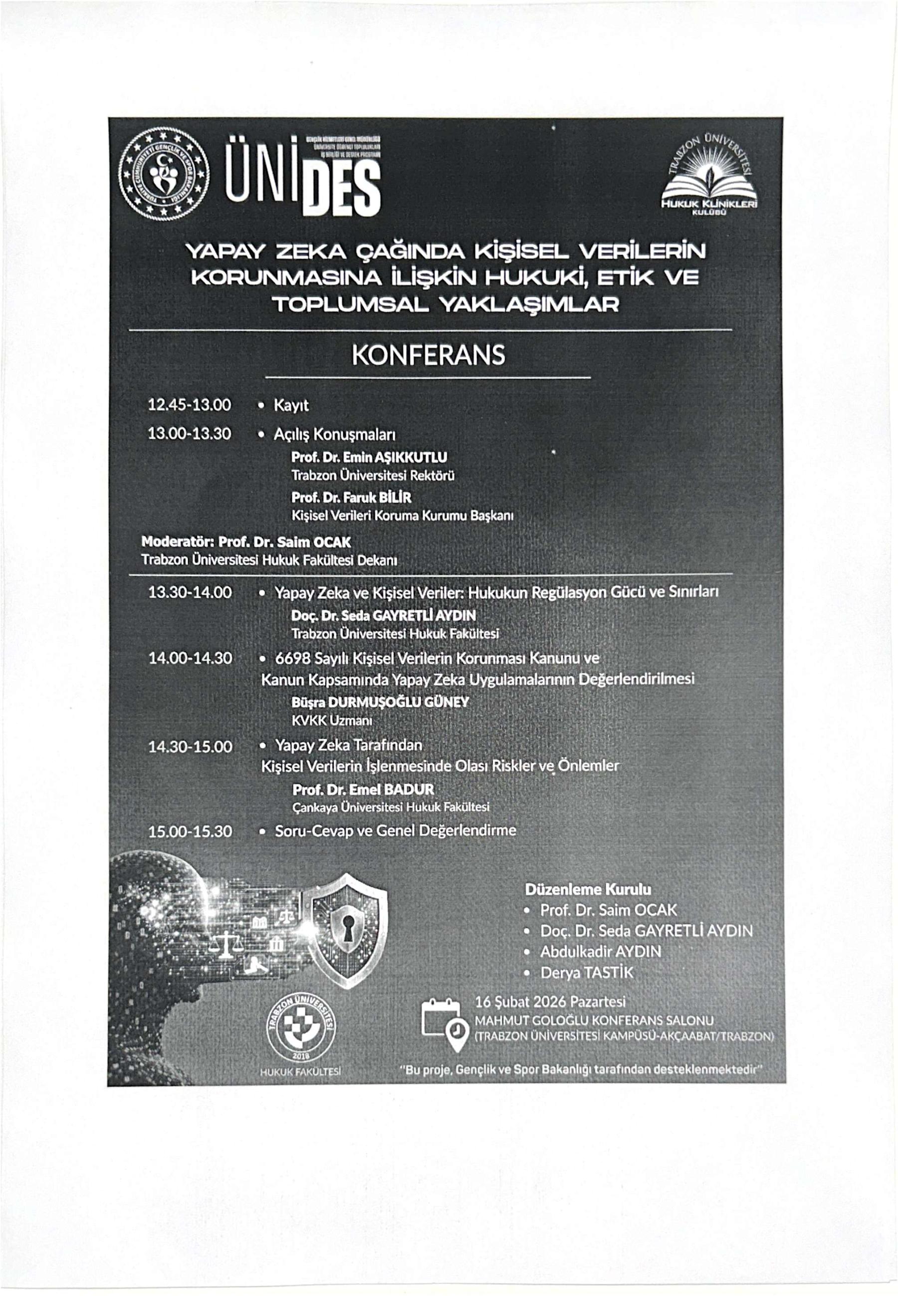 Trabzon Üniversitesi Hukuk Klinikleri Kulübü tarafından 16 Şubat 2026 tarihinde ve 13.00-18.00 saatleri arasında Trabzon Üniversitesi Mahmut Goloğlu Kültür Merkezinde "Yapay Zekâ Çağında Kişisel Verilerin Korunmasına İlişkin Hukuki, Etik ve Toplumsal Yaklaşımlar" konulu bir konferans düzenlenmesi planlanmaktadır.