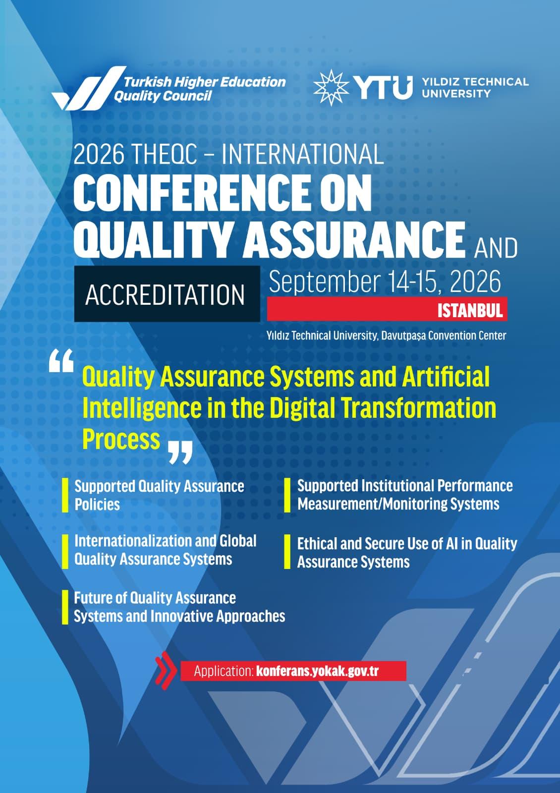 Yükseköğretim Kalite Kurulu Başkanlığı tarafından, 2024 yılında başarıyla tamamlanan, ulusal ve uluslararası düzeyde yoğun ilgi gören 2024 YÖKAK Uluslararası Kalite Güvencesi ve Akreditasyon Konferansı'nın ikincisi olarak, Yıldız Teknik Üniversitesi ev sahipliğinde 14–15 Eylül 2026 tarihlerinde İstanbul'da "Dijital Dönüşüm Sürecinde Kalite Güvence Sistemleri ve Yapay Zekâ" temasıyla 2026 YÖKAK Uluslararası Kalite Güvencesi ve Akreditasyon Konferansı düzenlenecektir. Detaylı bilgi ve bildiri çağrısı için tıklayınız.
