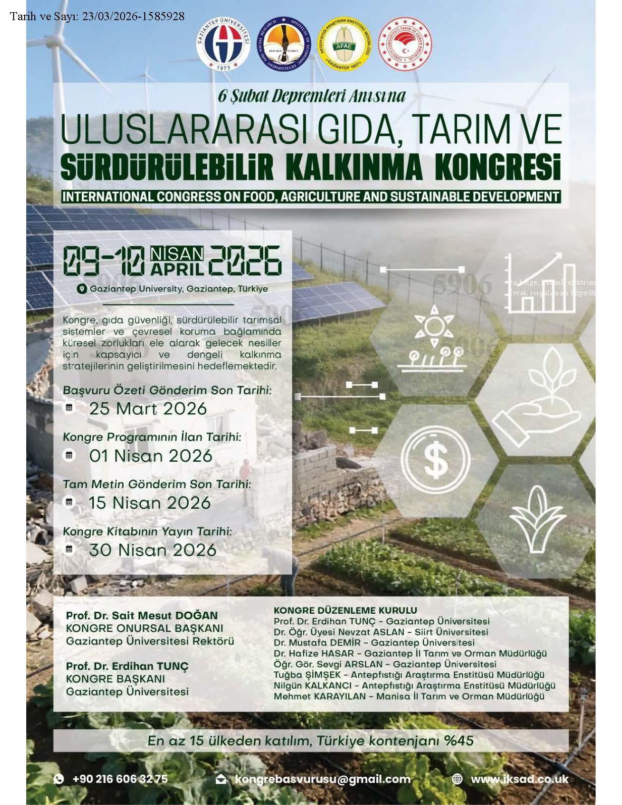 Gaziantep Üniversitesi Fen Edebiyat Fakültesi Biyoloji Bölümü Öğretim Üyelerinden Prof.Dr. Erdihan Tunç, Üniversite ev sahipliğinde 9-10 Nisan 2026 tarihlerinde çevrimiçi olarak "Uluslararası Gıda, Tarım ve Sürdürülebilir Kalkınma Kongresi" düzenleyecektir. Kongreye ilişkin detaylı bilgi için tıklayınız.